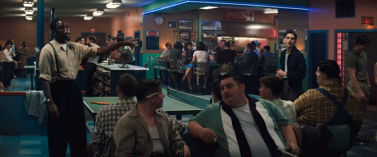 Dans ce contexte, la trajectoire de Marty résonne fortement avec l’Amérique contemporaine, marquée par la résurgence d’un discours autoritaire exaltant la réussite individuelle et la figure de l’homme d’affaires providentiel. La rhétorique de Donald Trump, valorisant la victoire permanente et la performance comme preuve morale, trouve ici un miroir troublant. Marty incarne une subjectivité néolibérale avant l’heure : persuadé d’être élu, convaincu que la volonté suffit, prêt à instrumentaliser les autres pour atteindre son but. Rachel et Kay sont reléguées au second plan et ce choix est politiquement risqué mais cohérent. Plutôt que de plaquer un regard contemporain correctif, les images acceptent la hiérarchie genrée des années 1950 et montrent ces femmes comme elles étaient regardées alors : périphériques dans le récit public de la réussite masculine. Cette marginalisation n’est pas une absence. Rachel, notamment, développe sa propre stratégie en s’immisçant dans la trajectoire de Marty pour le contraindre à assumer sa paternité. Elle ne conquiert pas la scène, elle en modifie la gravité. Ce déplacement discret — de la performance vers la responsabilité — constitue l’un des gestes les plus subtils de l’ensemble : laisser visible la domination masculine sans la corriger artificiellement, afin d’en exposer la structure plutôt que d’en adoucir les contours.