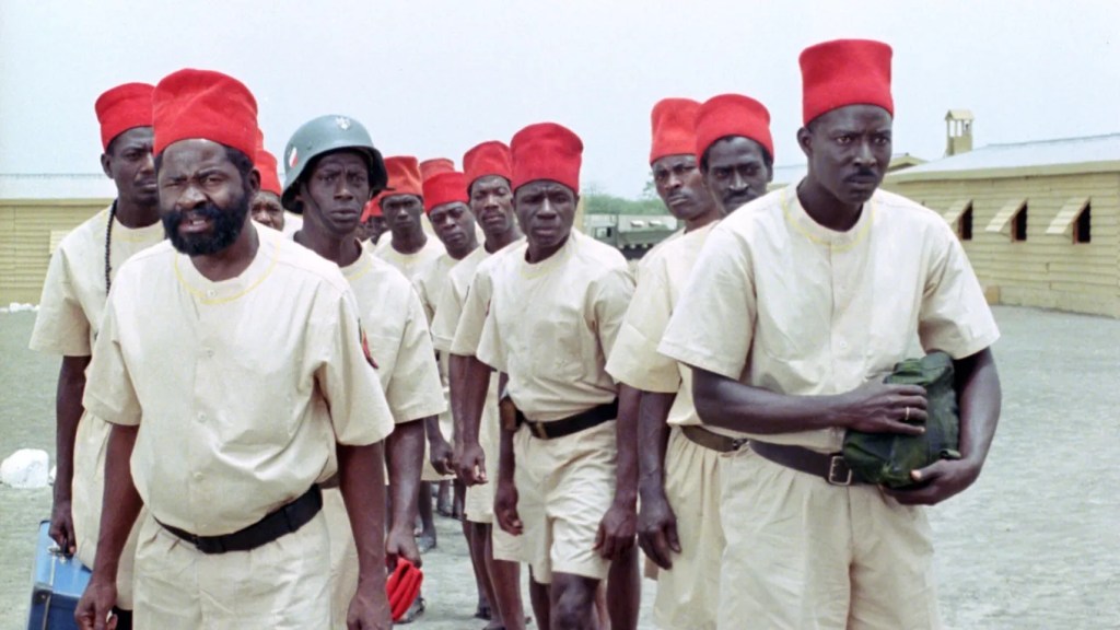 C’est la naïveté de Diatta qui signe sa perte : en considérant comme ses “pairs” ceux qu’il voit comme des camarades d’uniforme, il en oublie leur plus simple attribut, une couleur de peau qui pour eux fait toute la différence. Pour l’administration militaire, les tirailleurs sont des sous-hommes à qui donner le même solde qu’aux soldats français reviendrait à les tenir pour égaux en statuts et en droits. Ce qu’il voit comme une négociation réussie est un bras de fer truqué. Diouana, elle, n’est pas aussi naïve et préfère se donner la mort plutôt que de l’offrir à l’homme blanc. Le geste fatal est à sa manière le dernier dialogue prononcé. Dans La noire de…, les quelques répliques que nous percevons après la mort de Diouana n’ont que peu d’importance, déjà en ce qu’ils sont échangés entre des personnes qui ne peuvent se comprendre (toujours le père blanc qui retourne à Dakar pour tenter d’acheter la sympathie d’une famille en deuil) mais surtout parce que nos sentiments sont extrapolés par le choc précédent, nous refusant à toute écoute autre. Camp de Thiaroye se veut plus retors en ce qu’il nous laisse l’impression d’une victoire. Même en connaissant l’histoire tragique qui a conduit à la mort de centaines de tirailleurs sénégalais – François Hollande, quand il se prononce sur le massacre, en admet 75 –, nous sommes dupé·es, persuadé·es d’une fin heureuse avant que justement la dernière réplique, un ordre d’extermination, ne surgisse. On ne peut plus rien entendre après cela.