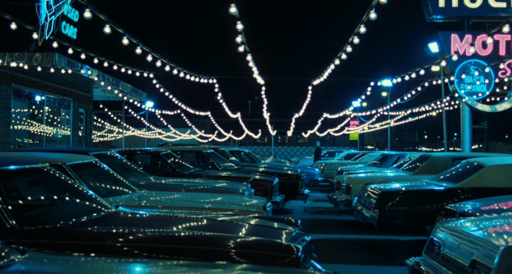 Désormais forcé de prendre les armes, et de se tirer de sa situation par la violence brute, Frank démontre de sa mélancolie, inhérente à l’ambiance que Michael Mann fait transparaître. Enclavée, Chicago semble un îlot perdu entre des mers inaccessibles qui enferment les personnages et ne leur offrent aucune issue. On ne voit que peu la ville, elle qui semble éteinte, désincarnée. Les rares moments extérieurs la montrent vide, toujours surplombée par ces étendues bleutées qui en montrent les limites, sorte de seconde prison à ciel ouvert, Frank étant constamment enfermé dans les intérieurs. Bureaux de ses diverses affaires, de l’agence d’adoption jusqu’au diner où il tente de convaincre Jessie d’un futur possible, ces derniers sont tout aussi froids, sans vie, comme les murs de la prison de Larry Murphy. Il en va de même pour la panoplie de personnages antagonistes. Lorsque les pontes de l’organisation pourtant bénéficiant d’une aise financière certaine sont montrés, ils ne sont jamais honorés par leur statut et subissent eux aussi l’aspect crépusculaire de leurs actions. Chacun·e se raccroche à ce qui lui confère du pouvoir, de l’importance, sans jamais en savourer les éclats : une réalité fade, où sans but, même factice, pour s’accrocher, c’est l’agonie qui domine.