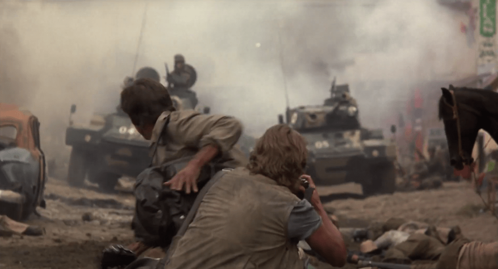 La cuite, justement, représente la prise de conscience par Richard Boyle des atrocités commises par le régime envers sa population et son basculement vers la cause rebelle. Difficile de ne pas voir un parallèle avec le parcours personnel de Stone, anticommuniste dans sa jeunesse avant de basculer du côté des peuples opprimés par l’impérialisme des Etats-Unis. Un point de bascule exprimé par une séquence de dialogue entre Richard Boyle et l’ambassadeur américain au Salvador (Michael Murphy) sur le soutien du pays à un régime d’extrême-droite. Mêlant réalité et fiction, le réalisateur reproduit dans ce cadre des évènements réels tels que l’assassinat de l’archevêque Romero au cours d’une messe ainsi que le viol et le meurtre de quatre religieuses et d’une missionnaire. Des séquences qui apparaissent comme un choc pour le spectateur – la scène de viol est difficilement soutenable – par la manière de filmer frontalement ces séquences, comme si le réalisateur voulait plonger de force l’américain moyen dans la réalité du pays.